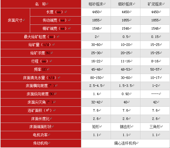 搖床選礦是一個(gè)傾斜的床面上借助機(jī)械石板對(duì)稱往復(fù)運(yùn)動(dòng)和薄層斜面水流等聯(lián)合作用,使礦粒在床面上松散分層,分帶,從而使礦物按密度不同來進(jìn)行分選的過程。